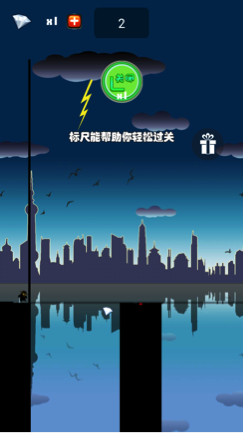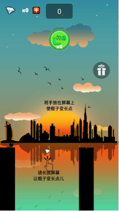 1、开始时玩家按住屏幕使棍子伸长,从而使小人能跨过对岸